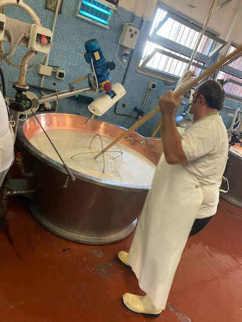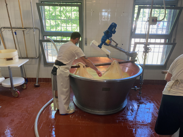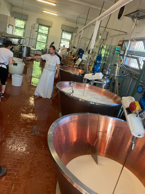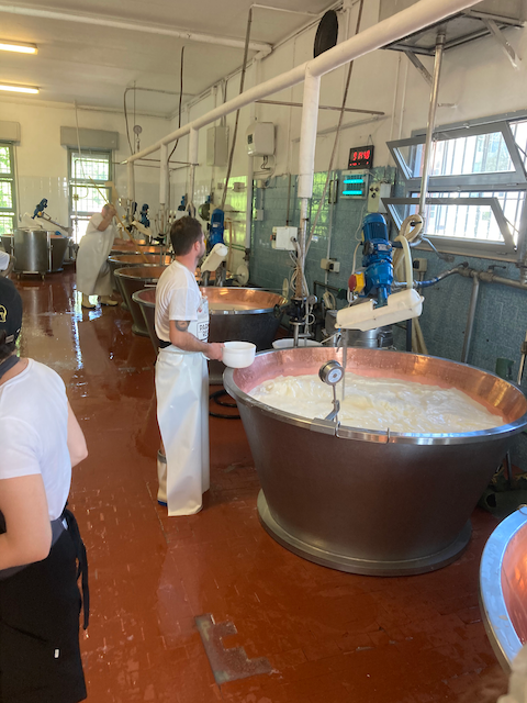 The process of making Parmigiano cheese is quite amazing. You see these copper vats that they churn milk. The process goes quite quick as it goes from ivory white to a creamy yellow. Then it begins too look like batter as the milk congeals into curds.