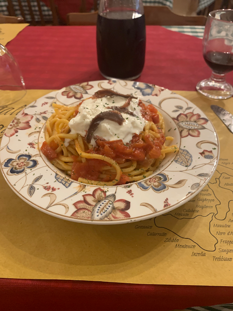 So I got the Piatto del giorno homemade pasta with tomatoes, (UPDATED, not scarmorza as earlier reported.) crescenza or strcciatella (like burratta) and anchovies. A buieatiful dish which when you tossed tiurned into a sublime treat for my overwrought tongue.
