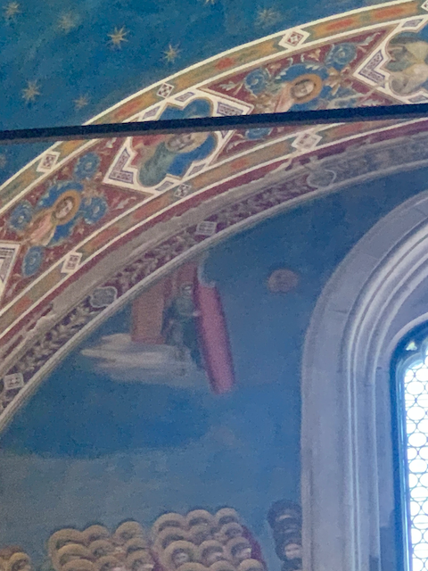 A slightly comical touch: the last judgement depcits the end of life on earth, so you see angels rolling up the sky--striking the set as it were.