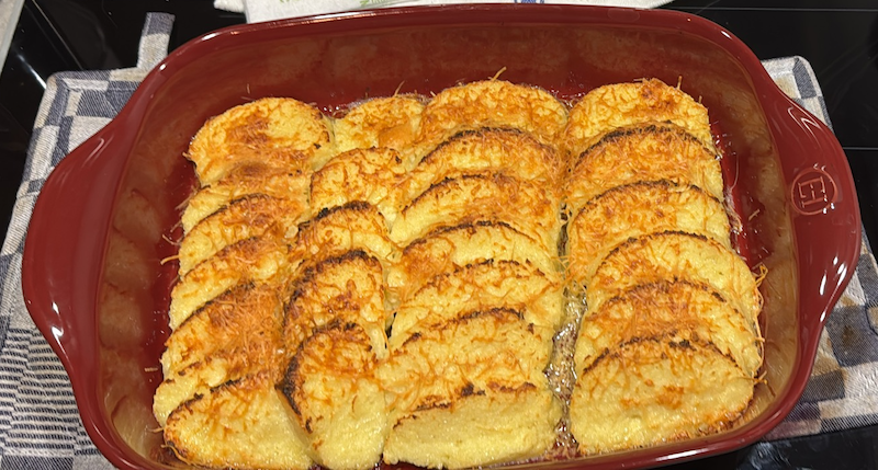 What a magnificent dish! The buttery cheese crunch on top and the tender, delicate parmigiana dumpling underneath. So the recipe is included here. It’s in Italian, but you can switch the language, and it comes with a video that is extremely helpful. I advise Americans not to look for just semolina but rather semolina for pastry, as that will most likely be semolino. If you are in a real bind I can help you order it.