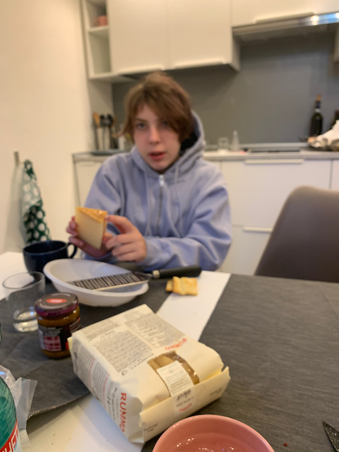 Esther grates the cheese in hew new hoodie she bought in town.