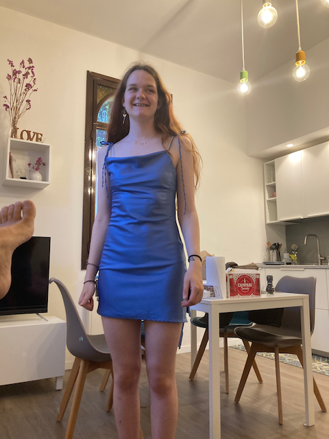 Sarah tries on a dress she bought in a shop in the city center (an American shop)