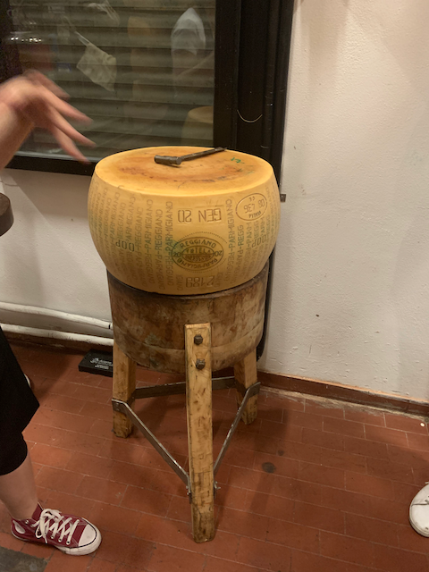 One small detail I left out of the cheese tour is this picture. Every wheel before it goes on sale, is tested by the cheesemaker with a mallet to make sure the wheel sounds good and there are no air pockets found. The air pockets do not effect the taste; however, the cheese can no longer be sold as Parmigiano. 5-6% of the cheeses are ruined every year; but the Factory maintains a contract with the cheesemaker that the ruined cheeses will never go above 10%.