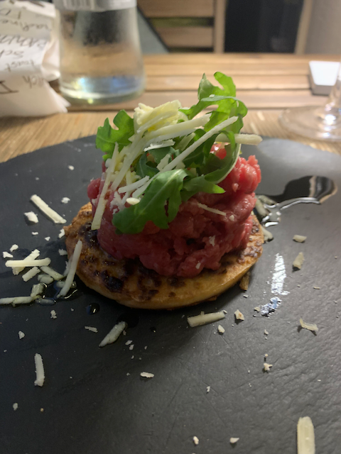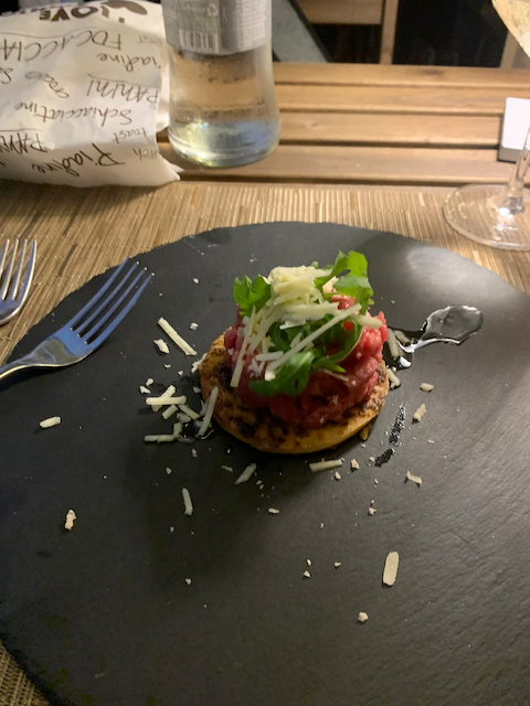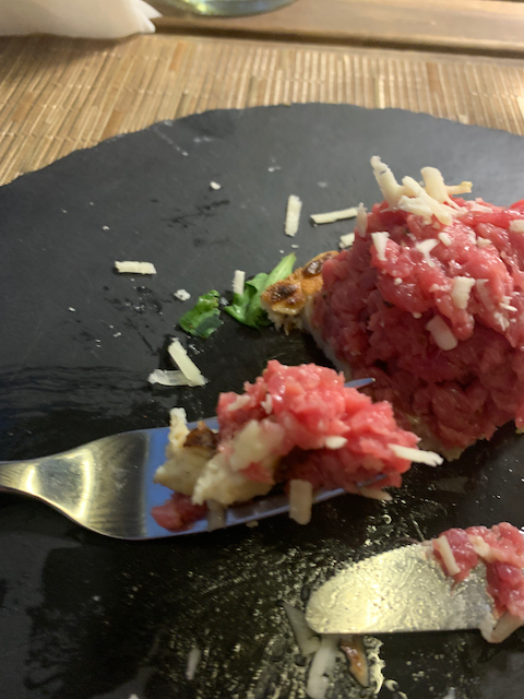The fasona tartare was a very special steak tartare using special cattle from Piedmont (not Oakland) called fasona. It was not a French steak tartare it was hardly spiced at all, and sitting atop a delicate pastry-like pancake, you could savor the sweet and mild flavor of the beef. IT was sprinkled with a aged cheese I had never heard of and a sprinkle of Rucola and a very light touch of olive oil. It was the most lovely tartare I had ever eaten. Subtle and the taste of the meet was truly sweet—not in the sugar sense of the word but extraordinarily pleasant on the palette. As an appetizer it was nevertheless the most expensive item on the menu at 14 euros.