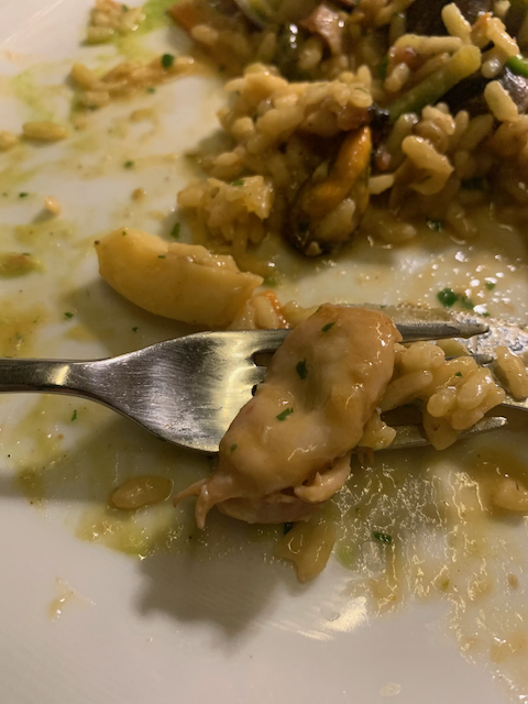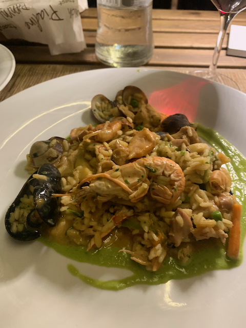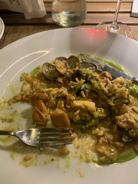 The next course was a seafood risotto. I was advised that the Ligurians like their risotto “all’onde” which meant it was extra soupy or watery. Well, that was a terrible simplified description. When I have usually had risotto, the dish is a whole the cream of the broth adheres to the risotto like a porridge for lack of a more delicate term. Here, the risotto was in an identifiable sauce. The al dente rice swam comfortable in a sauce that was distinct and so delicious I think it was the best seafood risotto I ever had and liken it to a more delicate version of the French Soupe de Poisson you could get just a few 100 kilometers east in Nice.