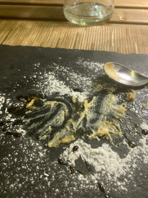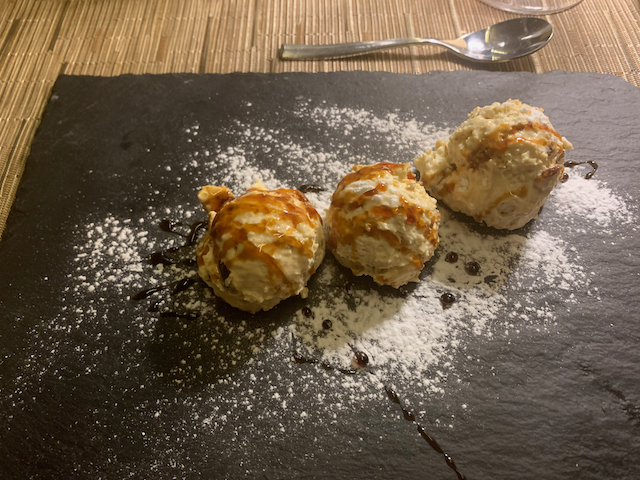 What came were three little balls of ambrosia. The Semifreddo is a Ligurian cross between gelato and whipped cream (very low calorie). Pan dolce, crumbled into it, is a sort of dense panettone served in Liguria during Christmas. The chinato caramel is a caramel made with an intense red kind of vermouth from Piemonte and with a rich wonderful flavor I would love to try and replicate at home.