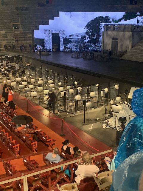Then drops of rain began to fell right during the most famous aria in the opera, "Voi lo sapete." Immediately the instruments were taken off stage and the percussion covered by a tarp as we waited for abiout on hour so that not a single drop of rain fell.