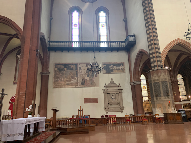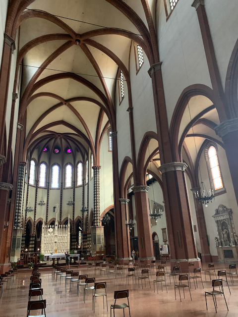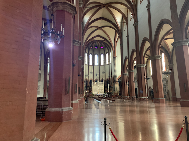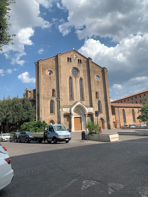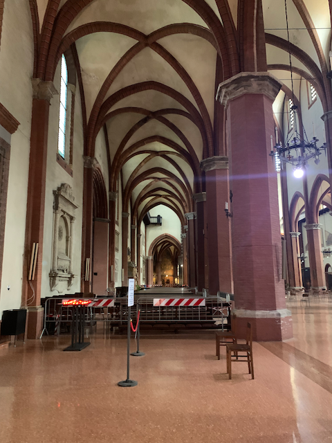 Esther and I walked through the city and stopped in the Basilica San Franceso in Bologna. Situated in a beautiful square, The church is medieval with unfortunately much of the ornamentation gone. Esther had a shirt that was only mid-length, exposing her belly button, this was a no-no for the church, luckily she had her hoodie with he and tied it over to cover. (Yes, she was carrying a hoodie with her in 90 degree weather--which came in handy a surprising number of times.)