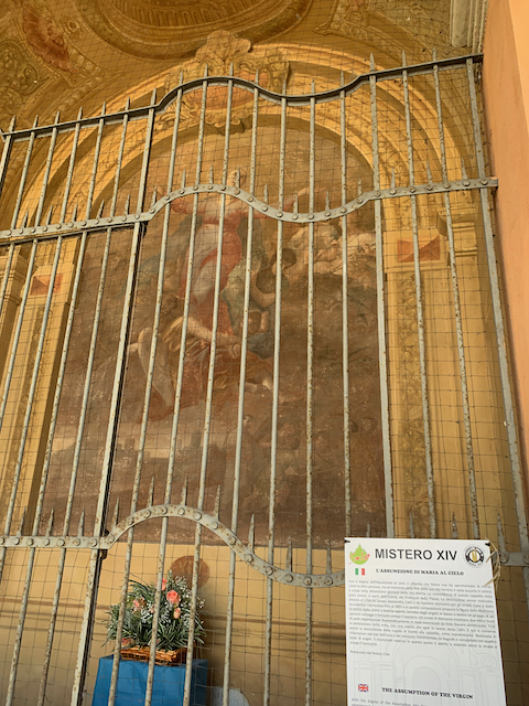 Esther and I walked the gallery. The long passage is marked by a series of paintings called the 15 Mysteries, each one depicting one of the 15 mysteries of ... well of what of Catholicism? Maybe one of our more informed readers can tell us more about that. It was a way one could gauge our progress ... at least until Minne came yo our rescue and picked us up, it was 93 degrees afterall.