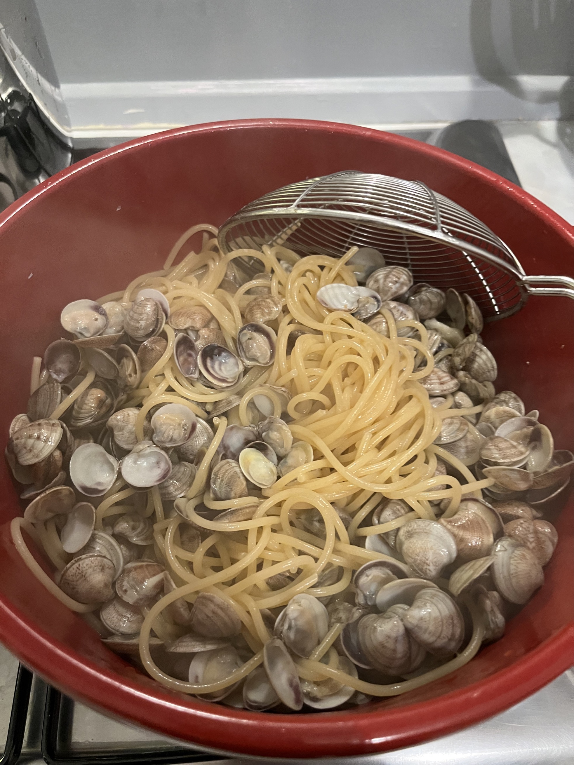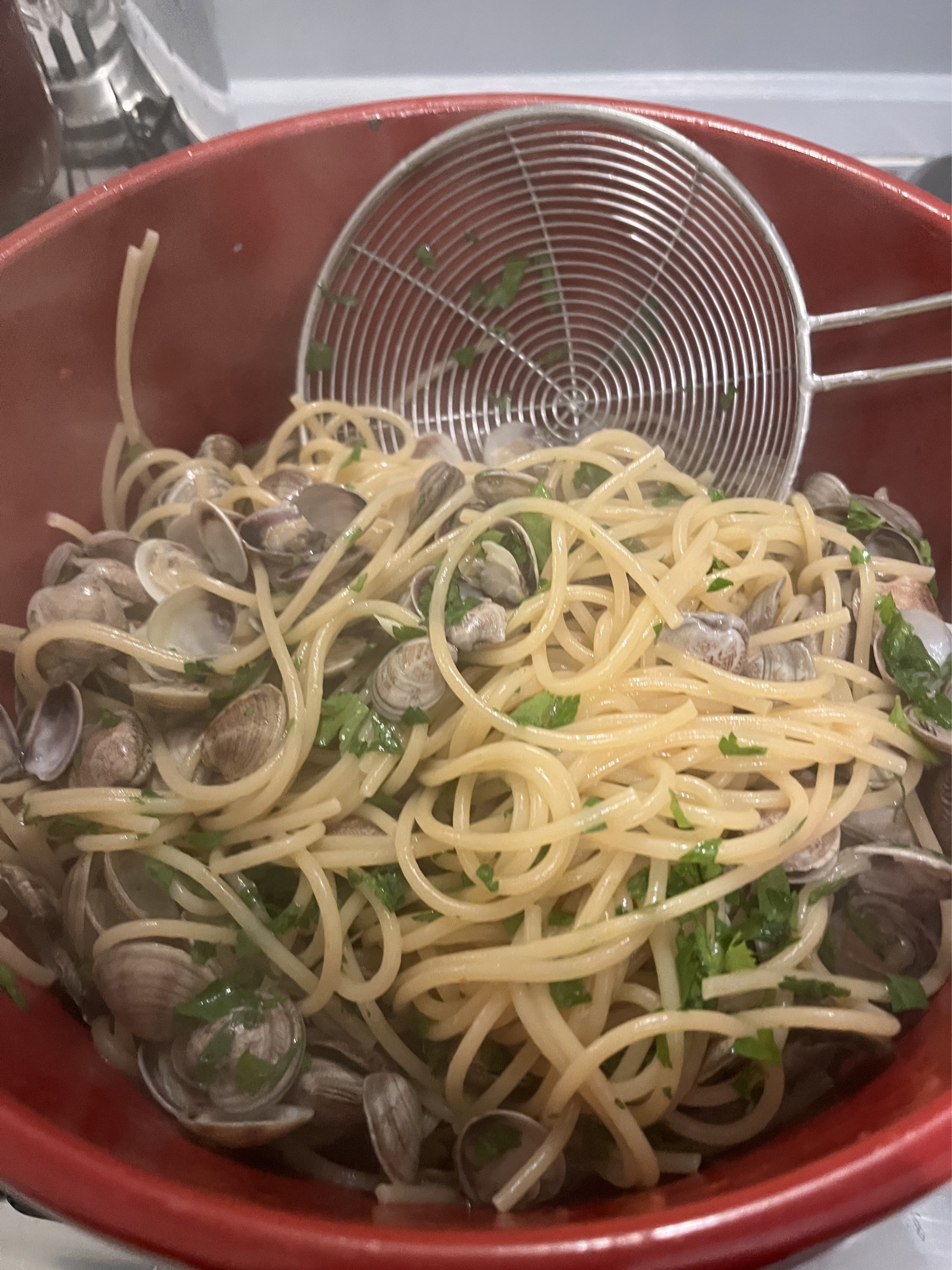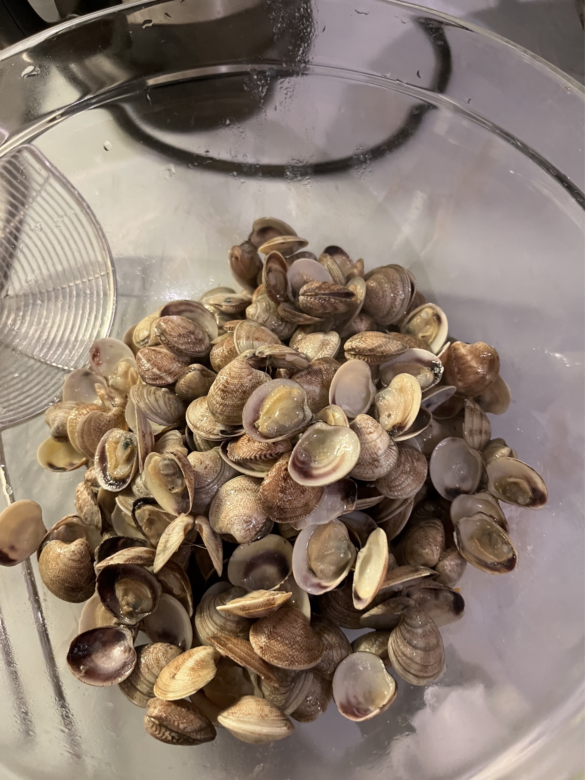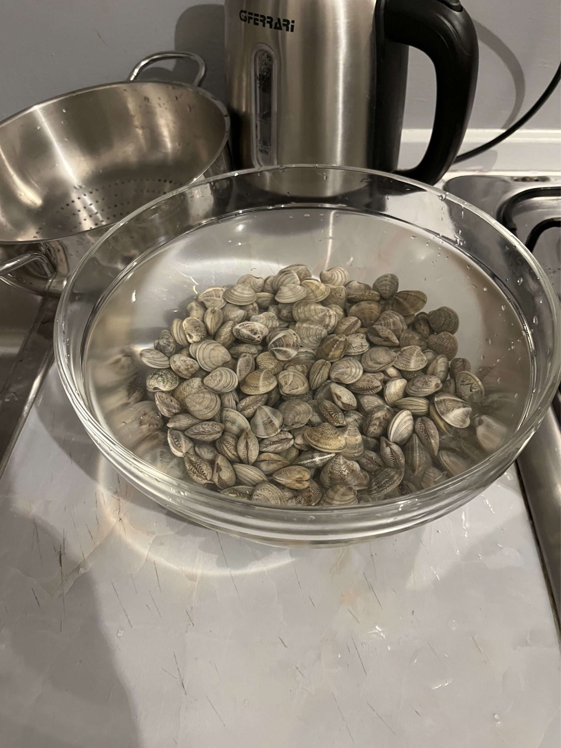 I am making spaghetti vongole or spaghetti with clams. I am eating late because they have to soak for 2-3 hours so they can rinse out their sand. Soak them in slated water so the water mimics the seawater they are used to. They are still living. Well most of them, i removed the ones that didn’t survive the trip from the sea to my house. To find out which ones didn't make it you tap each clam vigorously against the sink. Clams which are full of sand or otherwise dead will open up and you can toss them away. Likewise you toss away any clams with a broken or compromised shell