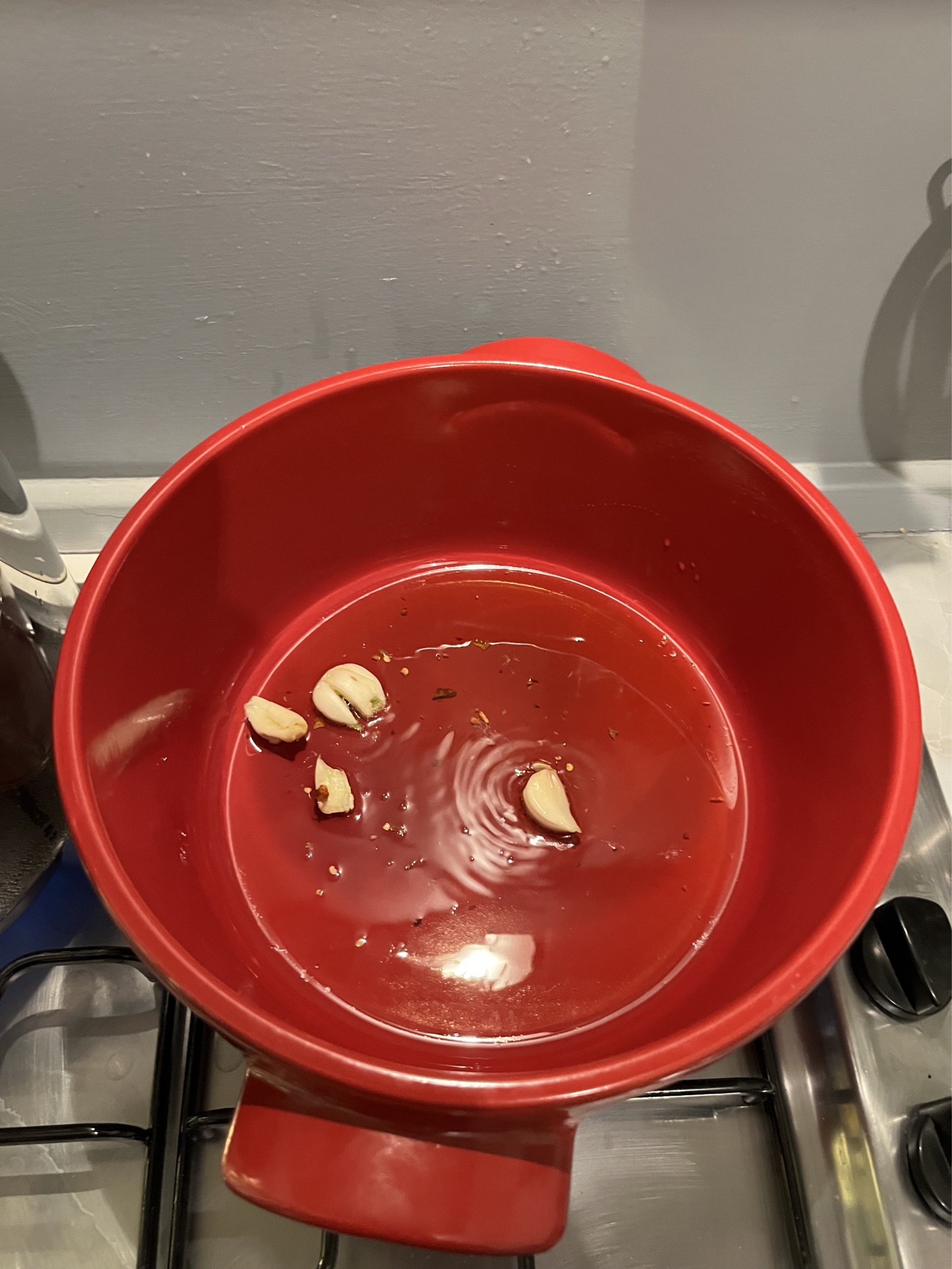 Put a skillet on high heat (I used a dutch oven but a skillet with a cover is better). Drizzle oil on the bottom of the pan add the garlic.
