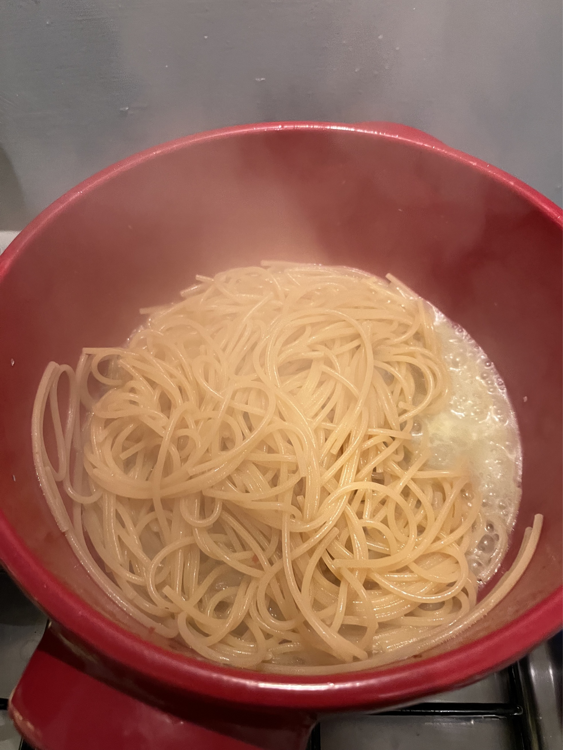 Before the soaking is finished, put the kettle of water on for the spaghetti and when it is about to boil start cooking.